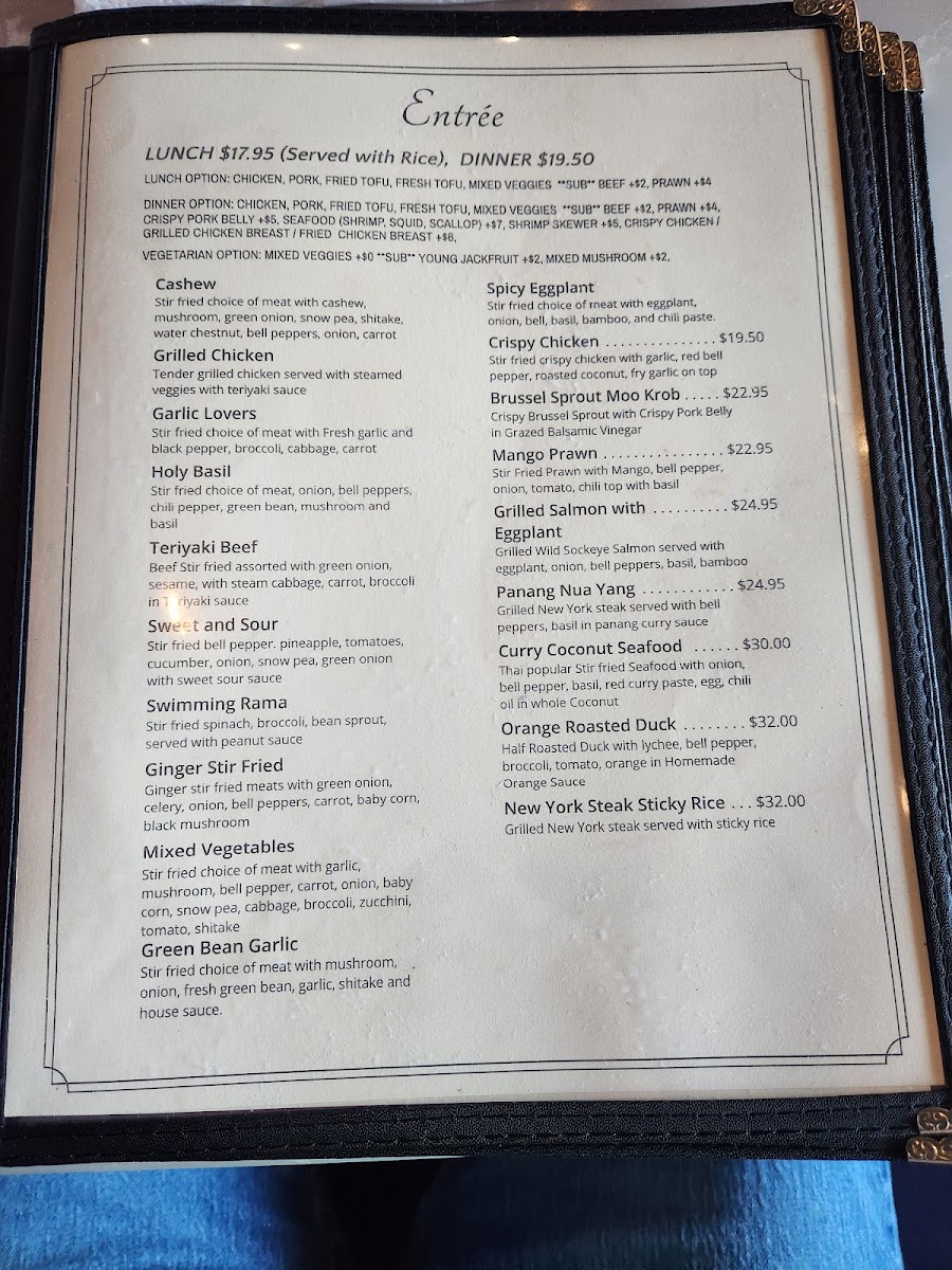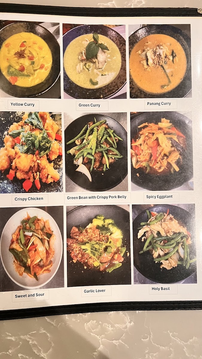 Stir fried choice of meat with eggplant, onion, bell, basil, bamboo, and chili paste.